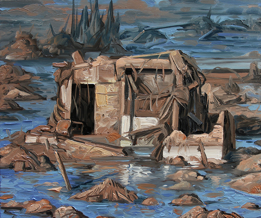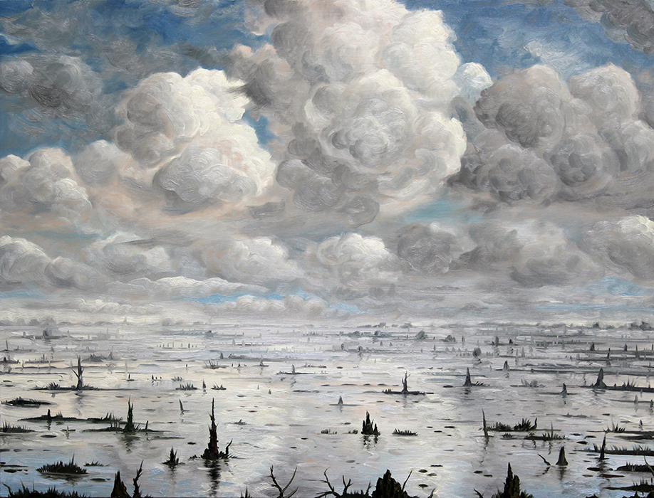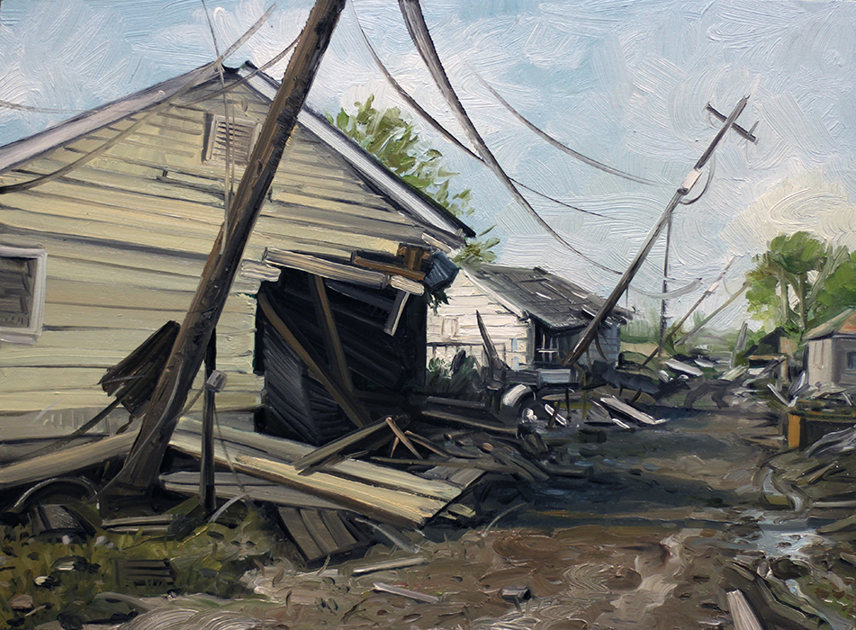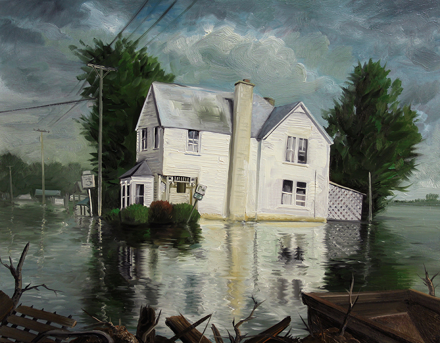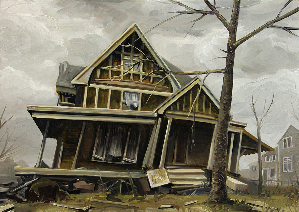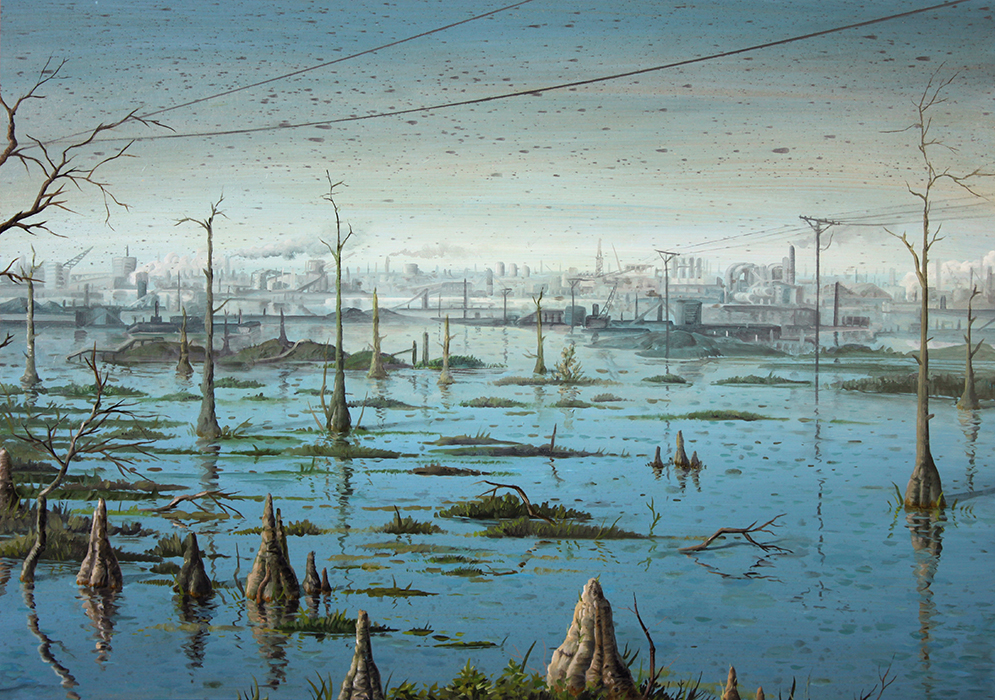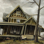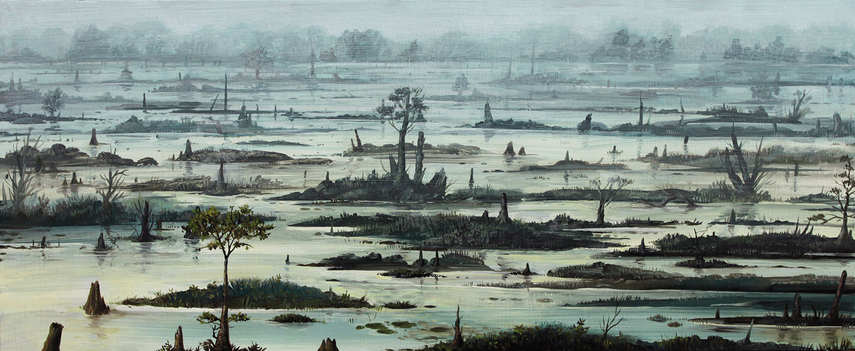 A series of paintings I made around 2015 depicting houses struck by hurricanes and floods, and on the other hand deserted, antediluvian looking swamps.